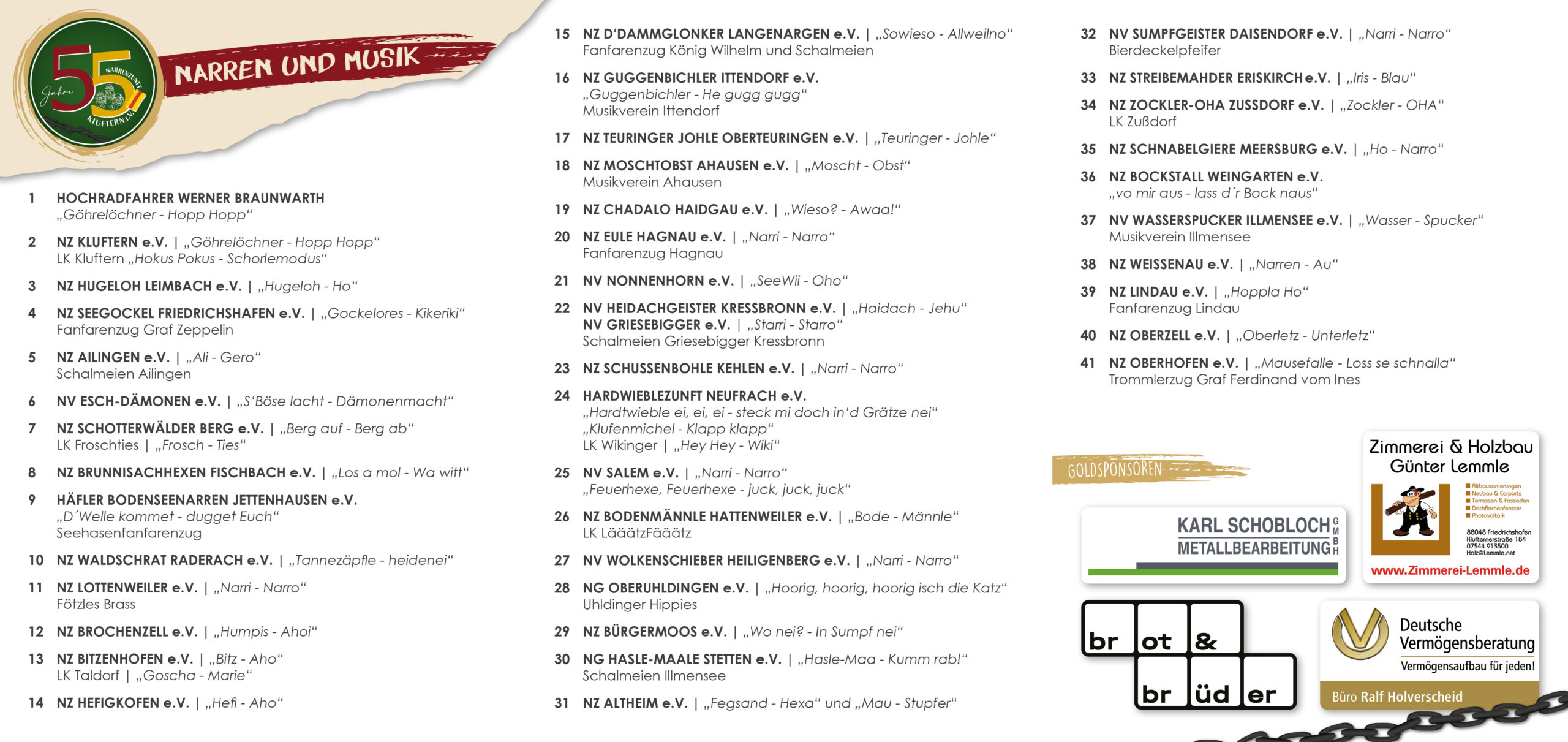 Am Sonntag den 25. Januar 2026 findet ab 14:00 Uhr unser großer Jubiläumsumzug in Kluftern statt.